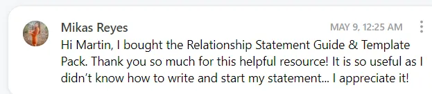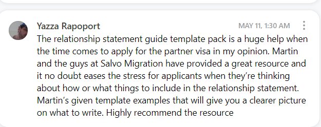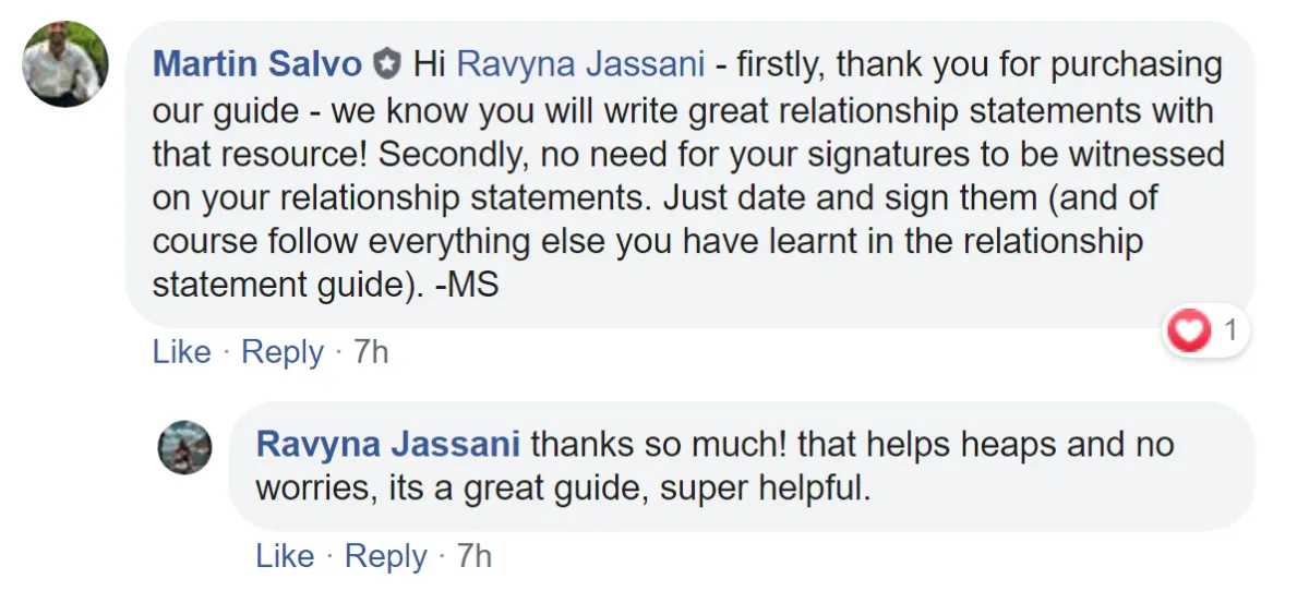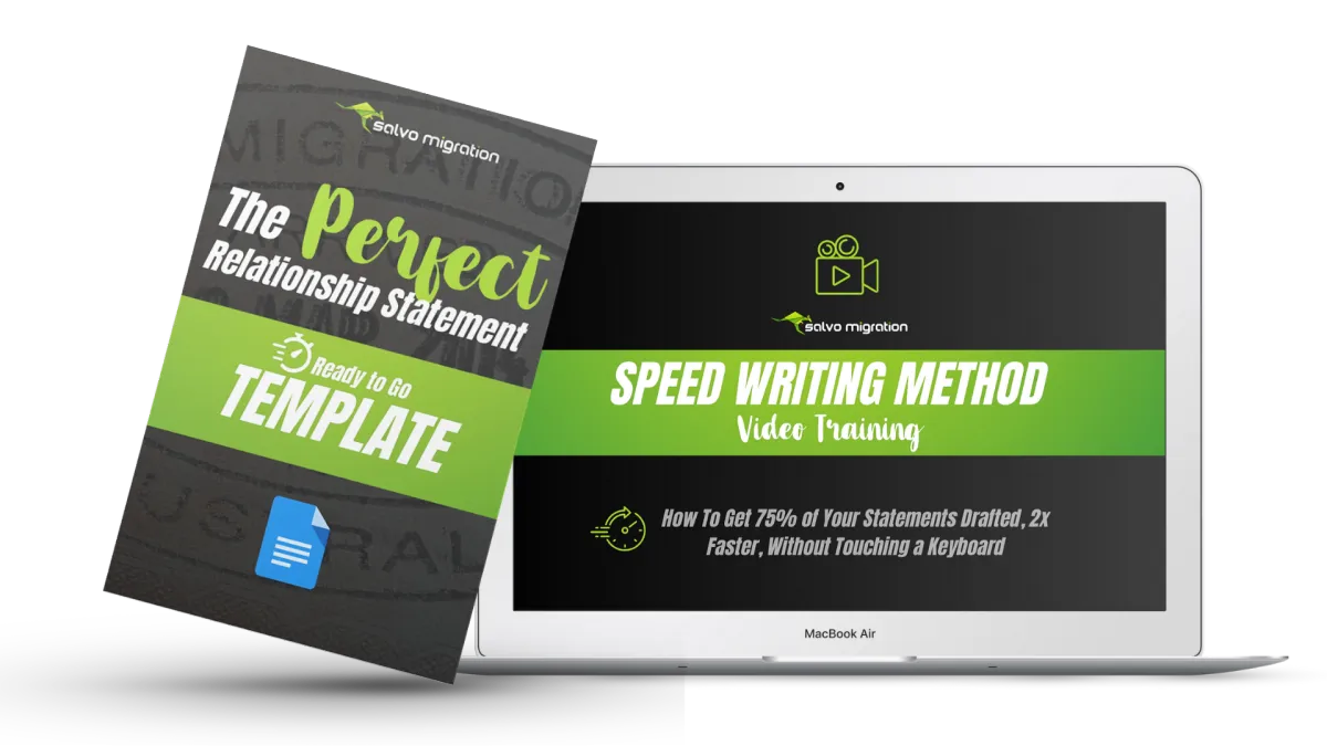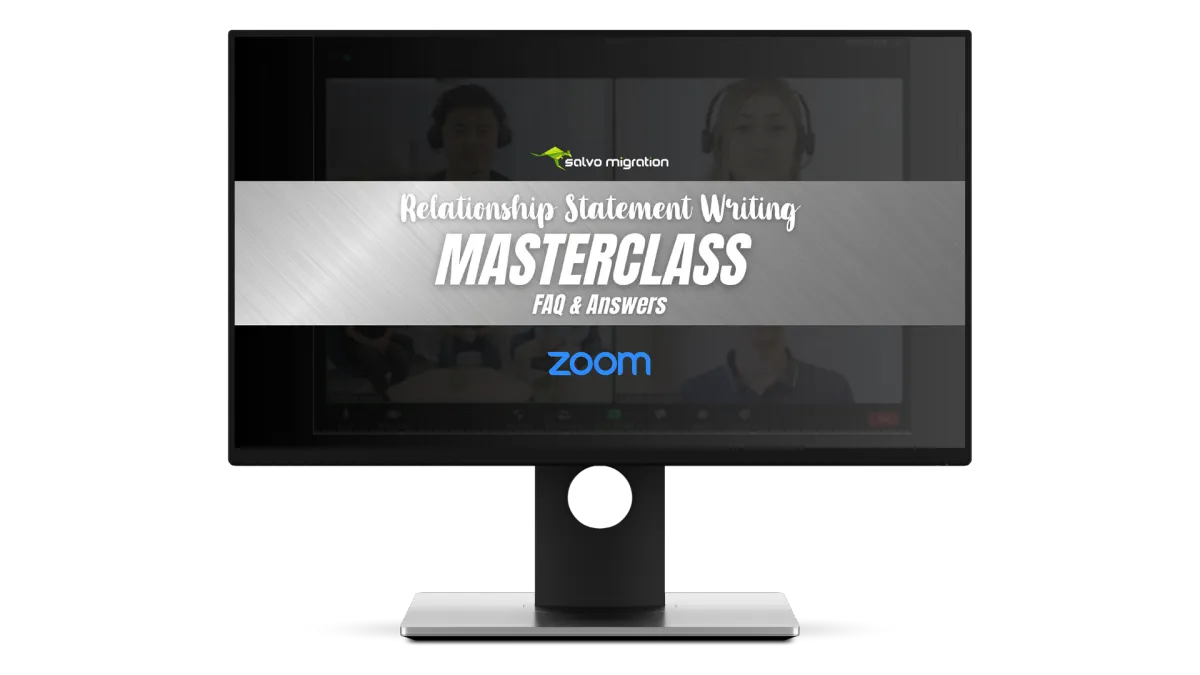 Relationship Statement Writing Masterclass (With FAQ & Answers) Video Training - What happens when you record a Zoom call between three experienced Australian Immigration Lawyers discussing the most commonly faced issues & questions people have when writing their relationship statements? You end up with a 45 Minute Relationship Statement Writing Masterclass! Upgrade your order and instantly watch this video to see the legal team at Salvo Migration (Martin Salvo, Mandeep Gill & Rachel Hamada - all accredited Australian Immigration Lawyers) provide qualified answers to the most common questions they see day in and day from partner visa couples writing their Relationship Statements).