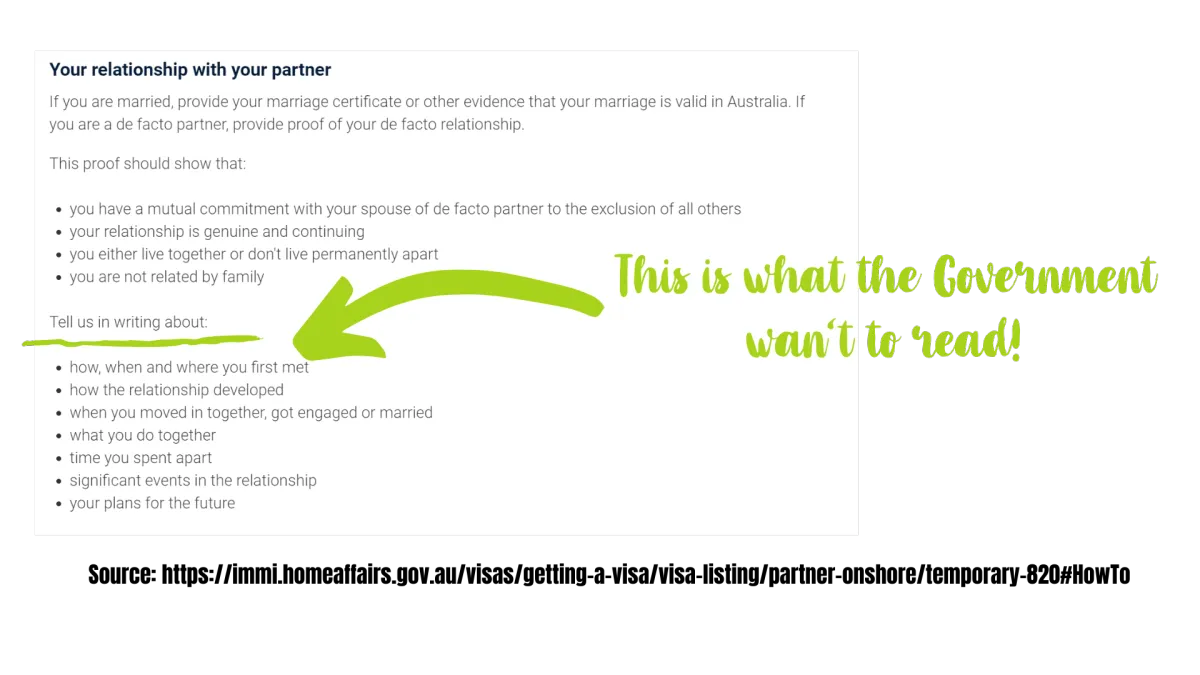 Some couples didnt know what to write about (i.e. they didnt know where to start, or, they wrote pages worth of their love story but did not sufficiently talk about their history, timeline, milestones or aspects of their relationship - being the legal criteria for the Partner visa. Put simply, they wrote too much about the wrong things and not enough about the right things).