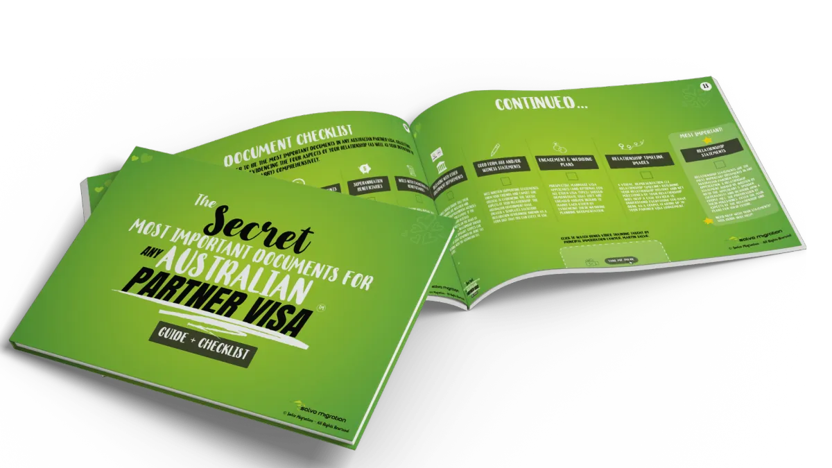 The Secret Most Important Documents For Any Australian Partner Visa (Guide & Checklist)™. Inside you will find over 20+ pages of legally researched information, diagrams, infographics and, of course, an easy to follow Checklist of the secret most important documents that will help you secure your Australian Partner visa.