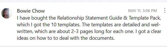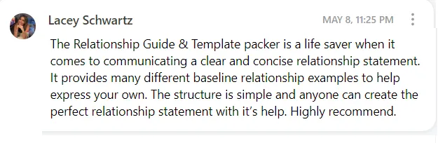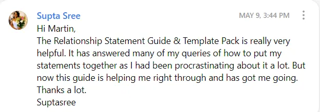 Ready to Go Word Template: Want to write your Relationship Statements quicker? Get our Ready to Go Word Template, which is a pre-configured/structured word document that you can simply download and start typing into. Everything that is taught in the The Optimization Framework, Things to Watch Out For List, Writing Checklist and everything else you learn about in The Perfect Relationship Statement Guide™ has been built into the Ready to Go Word Template meaning you just have to follow the prompts.