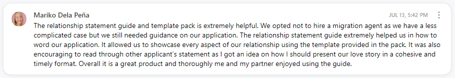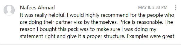 We of course removed all sensitive information, but we kept true to the original structure, flow and feeling of the initial versions, and in doing so, developed 10 x Examples to give to our clients modelled from 5 x successful Partner visa applications (i.e. we gave them an example of an Applicants Statement and Sponsors Statement)