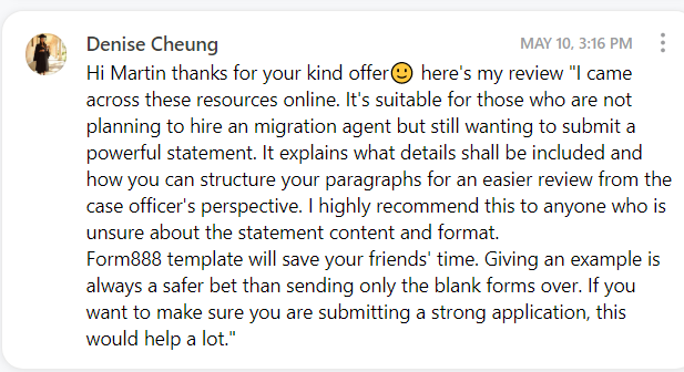 ONE TIME OFFER: Your Partner visa will require Form 888's written by your friends and family. It's a very common issue that partner visa applicants either struggle to get Form 888's returned from their friends/family, or, they get them but they are poorly written (we see this all the time). Form 888's are very important documents in demonstrating how those around you see your relationship and what you portray socially as a couple, which is one of the four main 'pillars' of any defacto or married relationship. To alleviate this problem, as a strictly ONE TIME OFFER, today you can add our 'Form 888 Swipe File’ for only $17 AUD (was $37)! It Includes 15 x Examples of well written Form 888's you can give to your friends and family to help them write theirs faster, and better! Just remember, you are dealing with multiple people, each with their own busy life and schedule. Your Form 888 is NOT their priority! Make THEIR life easier by giving them these templates to guide them. Help them help you! Instantly downloadable upon purchase.